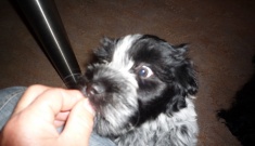 dagopvang heeft vindt dat zijn ‘balletjes’ hem in de weg zitten in het contact met andere honden. Met drie en een halve maand