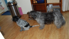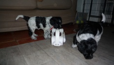 Met Freya gaat het uitstekend. Ze wordt steeds ondeugender en vrijer. Is nergens bang voor en blaft dapper met Lara mee als er onraad dreigt. Onze poes Sien benadert ze heel voorzichtig en snuffelt dan even aan haar. Sien vindt het prima. Lara neemt meestal een spurt als ze Sien ziet, zodat deze zich haastig uit de voeten maakt en door het kattenluik kruipt. Lara was daar toen ze nog pup was altijd heel kwaad over. Toen ze net bij ons was kon ze nog door het kattenluik maar toen ze wat groter werd natuurlijk niet meer. Ze heeft toen 2x een kattenluik dusdanig bewerkt dat ik nieuwe moest kopen. Compleet gesloopt. Freya is een paar keer door een luik ( we hebben er 3 zodat poes makkelijk binnen en buiten kan komen) gekropen en legt zich erbij neer dat dat nu niet meer lukt. Maar ze steekt wel haar kop er door heen als er aan de andere kant van de deur iets interessants is.
